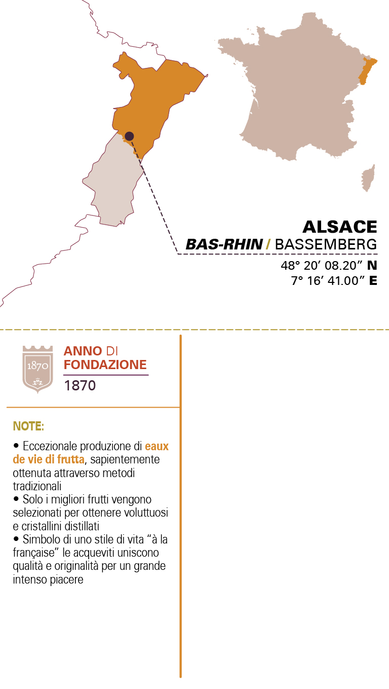 ZONA PRODUTTIVABassemberg MATERIA PRIMAPere Williams DISTILLAZIONELa bottiglia viene attaccata al pero in fiore e il frutto cresce all’interno del contenitore. Quando matura sia la pera che la bottiglia vengono delicatamente staccate. I frutti vengono messi in grandi tini per la fermentazione e lo zucchero che contengono si trasforma in alcool COLORELimpido trasparente PROFUMOAl naso ,la pera si rivela subito, è ben definito, sostenuto, fruttato e fresco. SAPOREFine ed elegante. Il sapore della pera è intenso e porta grande freschezza in bocca. Poi si evolve in un frutto maturo. Nota finale speziata di liquirizia, tipico della pera Williams.